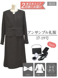 ゆとり設計で着心地ゆったり ウエストラインでスタイルアップ効果あり ブラックフォーマルアンサンブル(ノーカラージャケット+七分袖ワンピース)【靴 バッグ パール付き】レンタル 礼服 喪服 葬式 葬儀 法事 F00812S