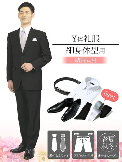 結婚式に Y体 細身体型用 スリムな礼服 ~6点セット~ フォーマルスーツ シングル【Yシャツ 靴 ベルト ネクタイ付き】レンタル礼服 略礼服 紳士 メンズ 礼装 冠婚葬祭 慶事
