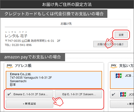 『ご注文手続き』のページで「お届け先」に間違いがないか確認してください。もし間違いがある場合は、図のようにお届け先ご住所を変更してください。