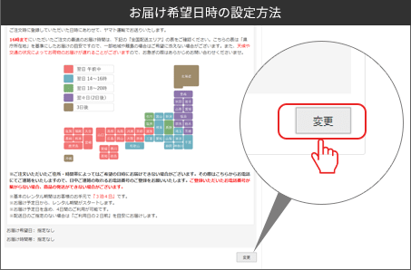 お届け日時に指定がある場合には『ご注文手続き』のページで「変更」ボタンを押して、お届け日時を必ず選択してください。
